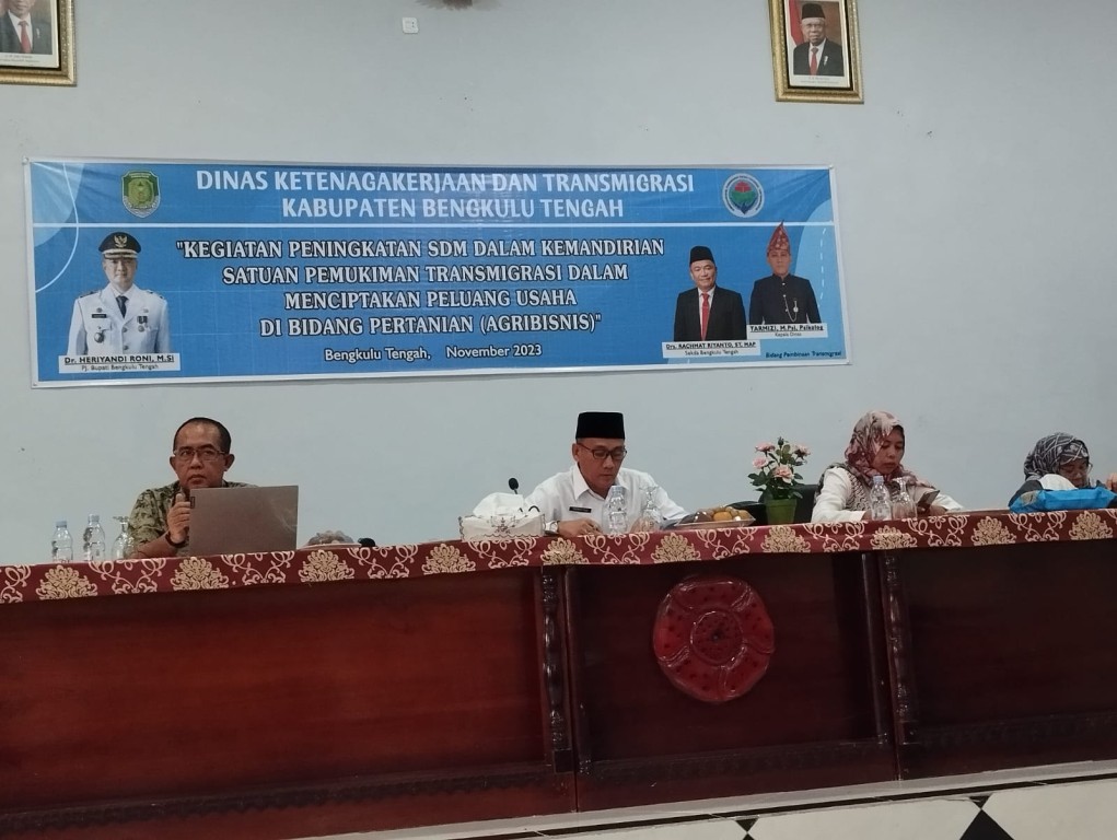 Raabu, 22 November 2023 Dinas Ketenagakerjaan dan Transmigrasi Kabupaten Bengkulu Tengah gelar Kegiatan Peningkatan SDM dalam Kemandirian Satuan Pemukiman Transmigrasi dalam Menciptakan Peluang Usaha di Bidang Pertanian (Agribisnis). Sosialisasi ini bertujuan untuk memberikan motivasi dan edukasi kepada masyarakat eks transmigrasi dan warga lokal dalam menciptakan peluang usaha baru dibidang pertanian dalam hal agribisnis dan agroindustri.